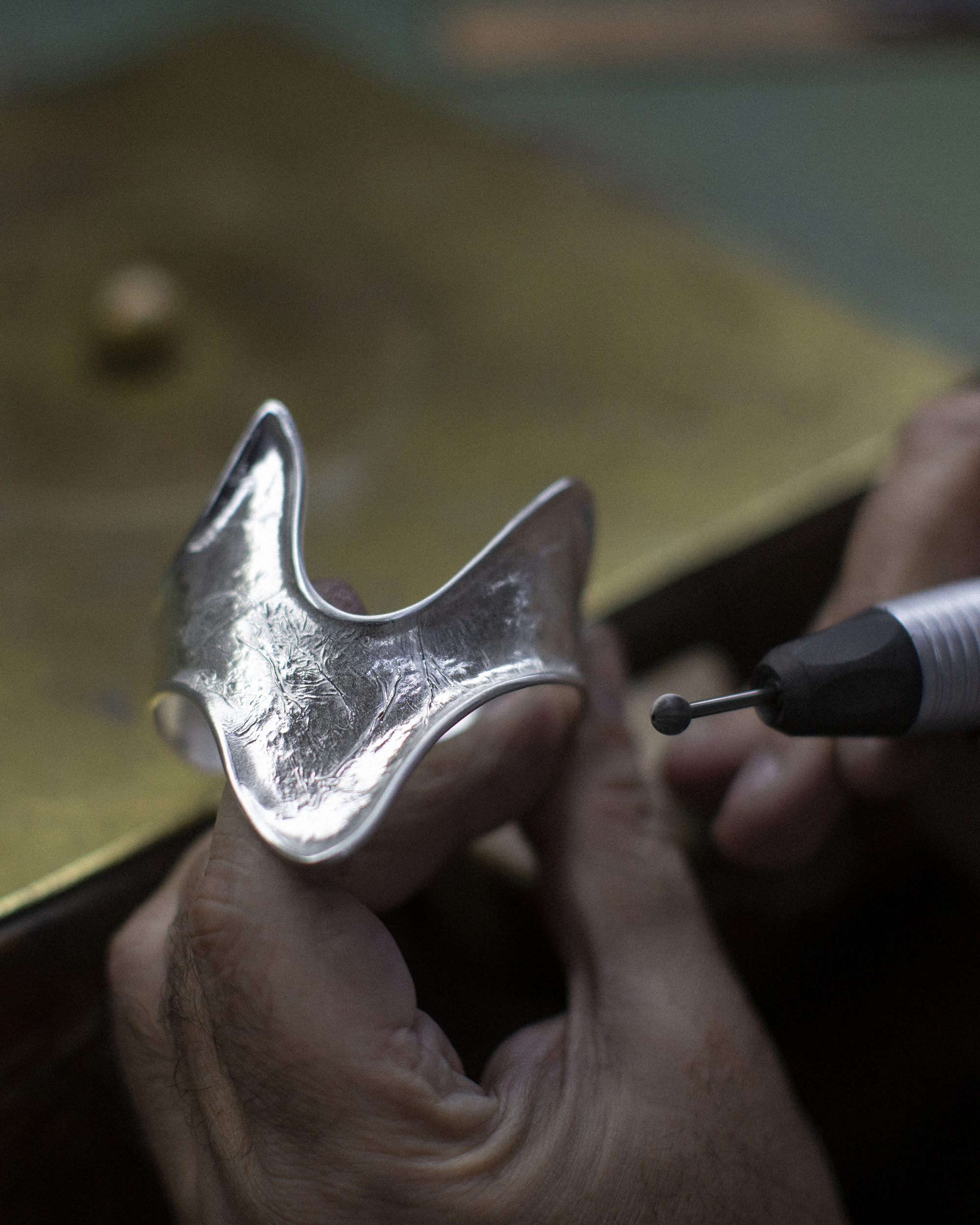After casting, the piece enters a final cycle of refinement: hand-cleaning, detailed finishing and the signature Eleftheriou polish. Matte and mirror surfaces alternate in a choreography of contrasts, creating powerful depth and unexpected luminosity. This interplay has become the hallmark of the Eleftheriou workshop.
